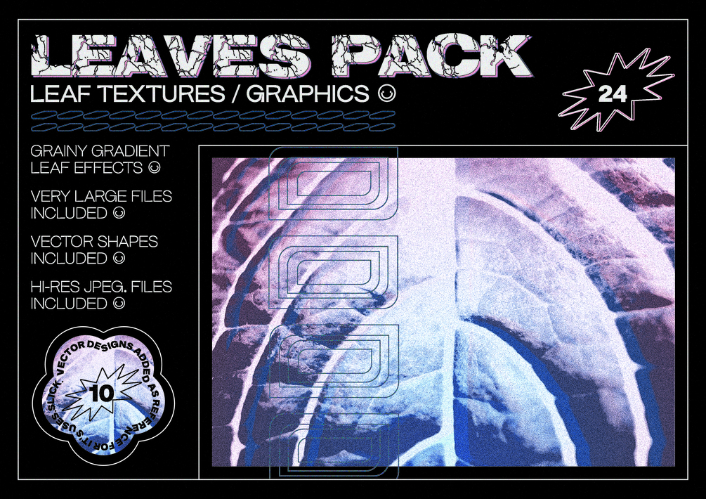 24+ grainy gradient leaf textured files that are various in size specs – all extra large jpegs. 10+ fully customizable vector shapes great for layering and image clipping effects — AI file.