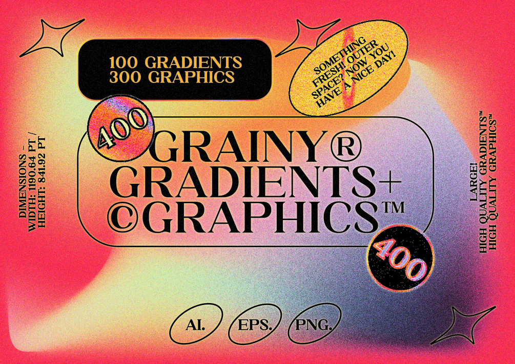 You get large sized gradients with grainy effects. Format - AI. / EPS. / PNG. (separate files for vector shapes) Image Dimensions - 841.8898 px by 595.2756 px Illustration Count - 100 Grainy effect Gradients + 300 fully customizable vector graphics