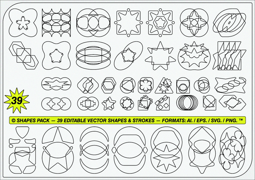 39 fun and unique graphics for poster design work, event designs and projects for experimental or other alternative personal use. Contains three versions of files with a total of 39 shape objects each - Grainy effects, solid objects and stroke outlines.